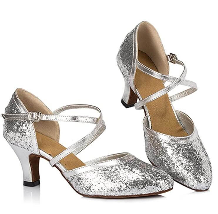 Silver Glitter Ballroom Dance Shoes Latin Salsa Closed Toe Dance Heels