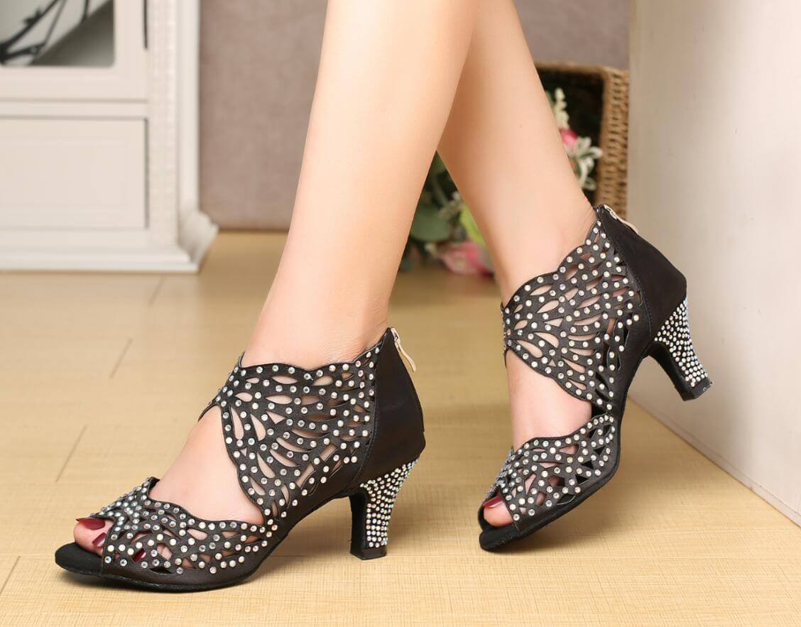 Black Satin Crystal Ballroom Dance Shoes Latin Salsa Performance Dance Shoes