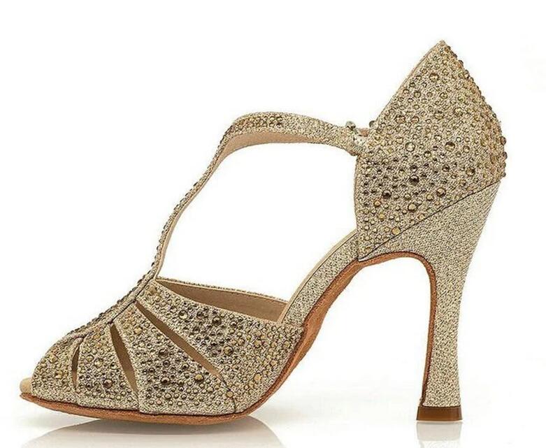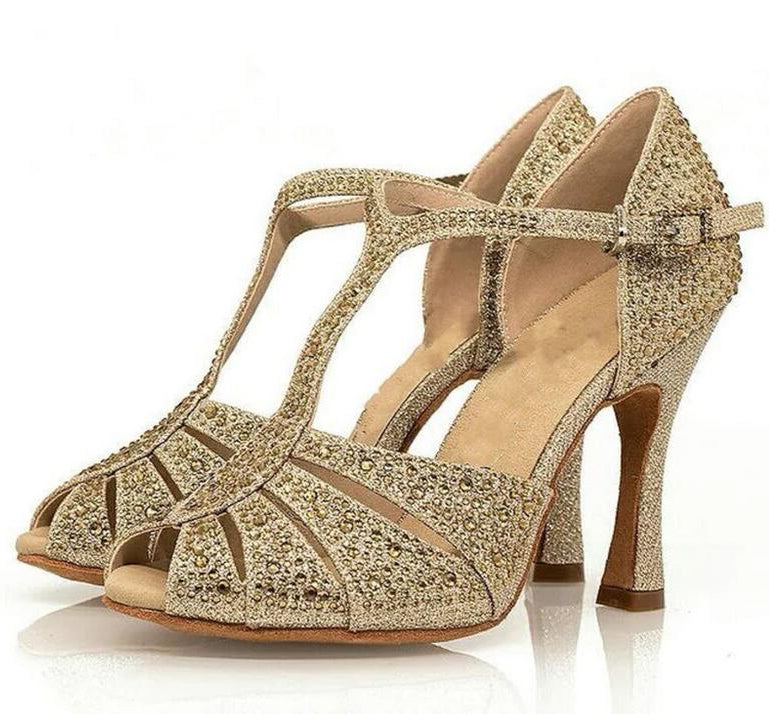 Gold Glitter Rhinestones T-Strap Salsa Latin Bachata Dance Shoes